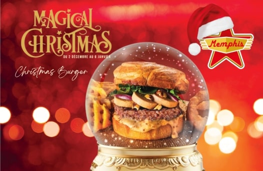 Bun brioché, haché frais façon bouchère, fromage à raclette, galette de pomme de terre, poitrine fumée, salade et sauce Memphis³.